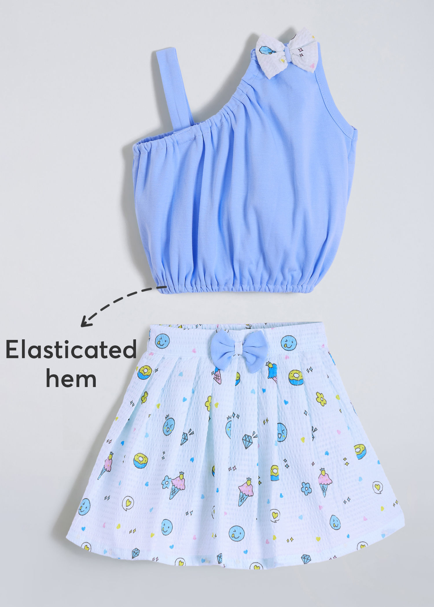 Sweet donut and heart print tank top with bow detail paired with coordinating skirt creates delightful charm.