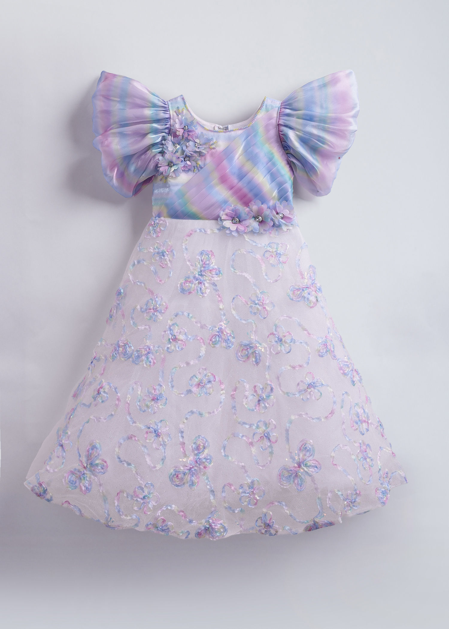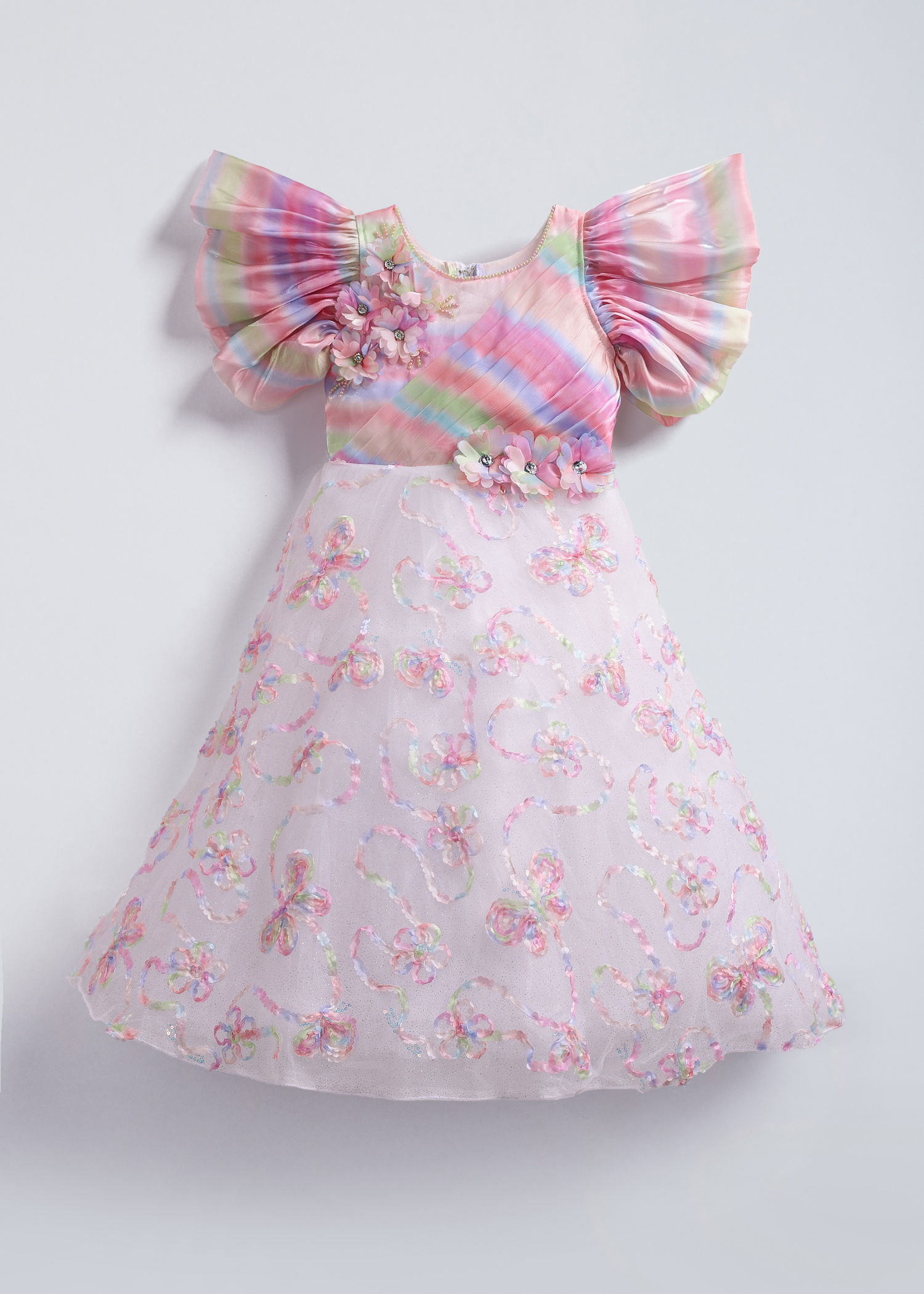 Pastel rainbow flutter sleeves add whimsical charm to delicate floral tulle layers. Soft rainbow hues meet botanical elegance for a dreamy party look.