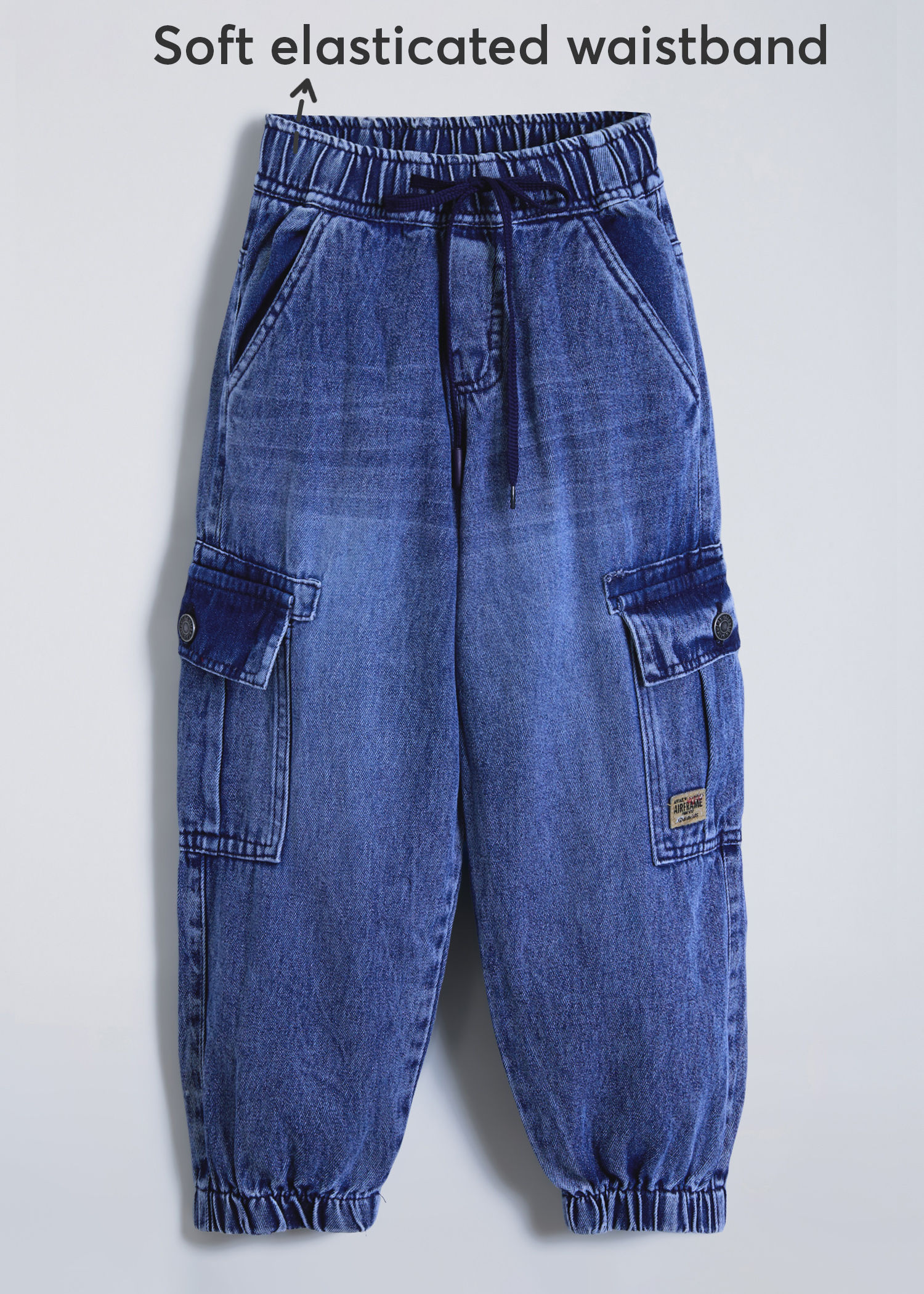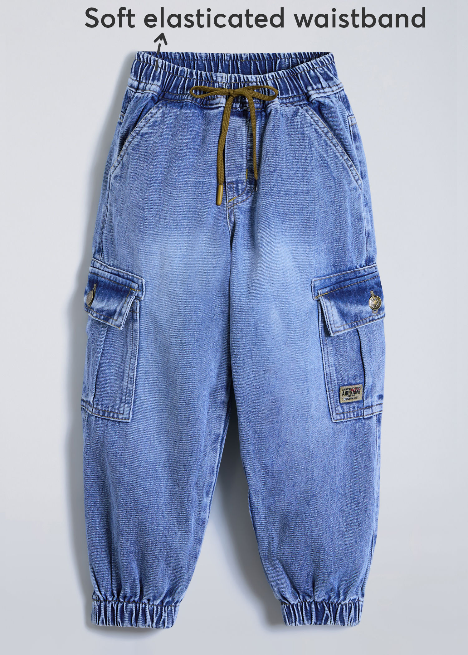 Adventure-ready cargo pockets add functionality to these comfortable denim joggers, featuring soft elasticated waistband for active kids who need style and storage.