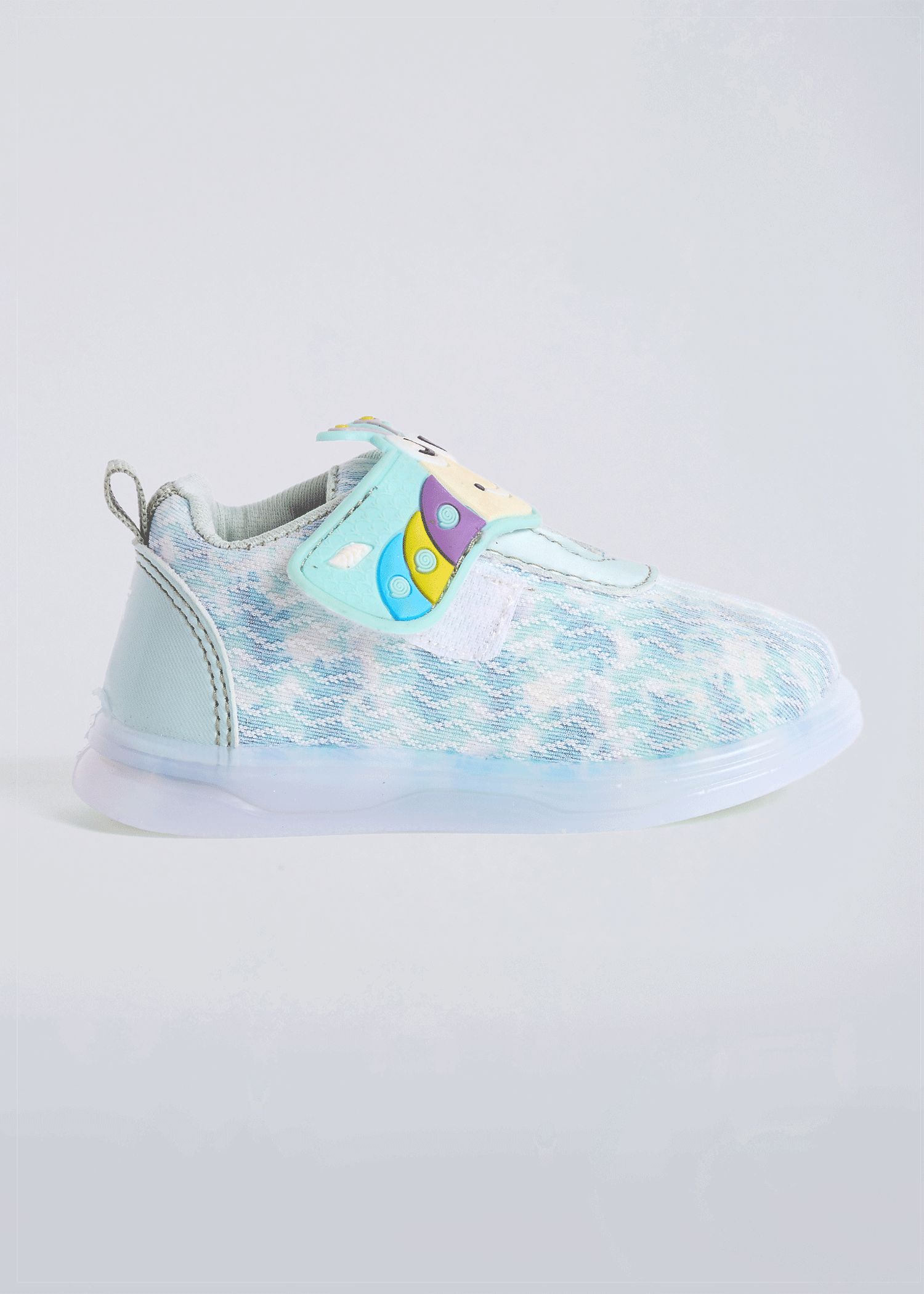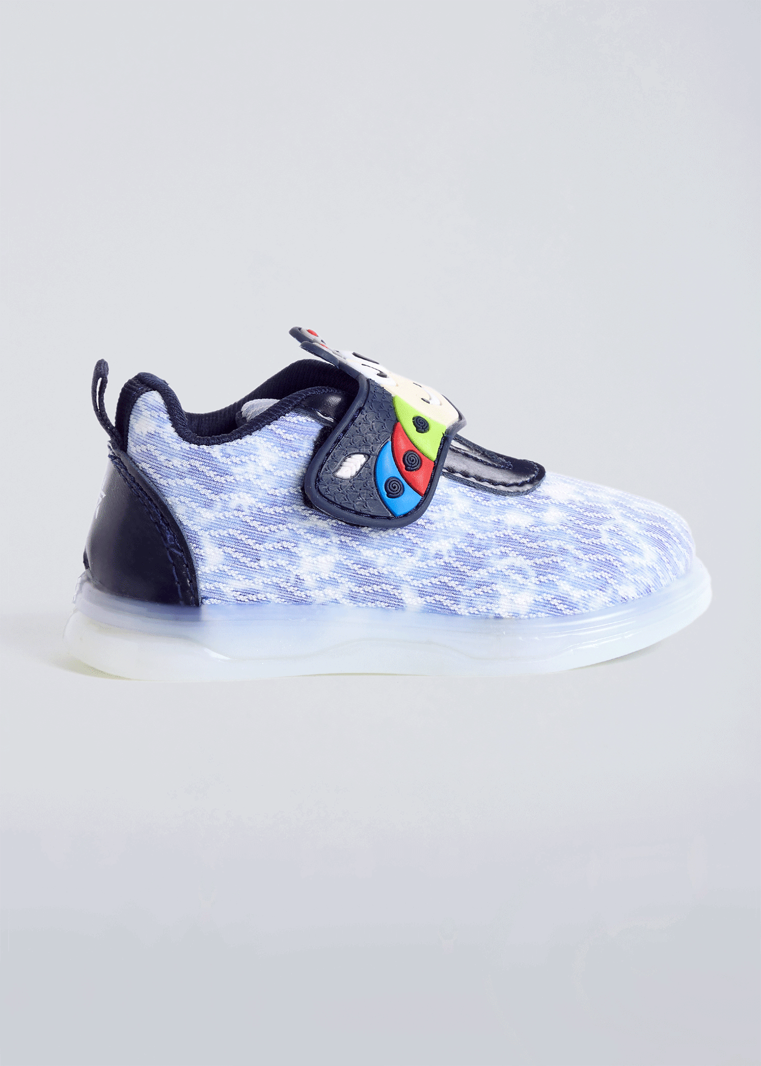 Adorable caterpillar character design on denim-textured upper with LED sole lights that flash with every step. Easy velcro closure style with elastic straps ensures quick changes while durable construction handles playground adventures.