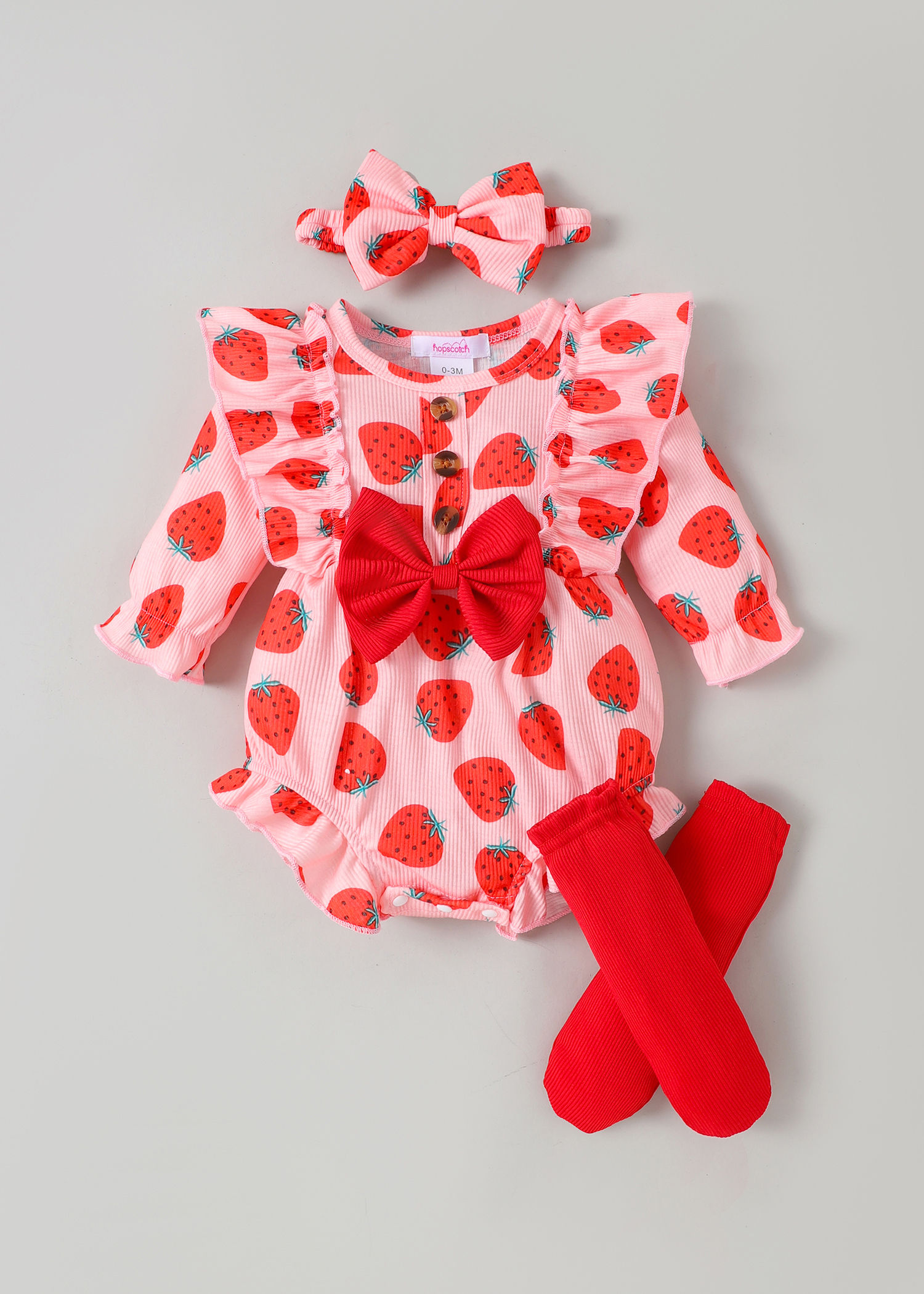 Sweet strawberry print onesie with ruffle sleeves and bow detail plus matching accessories for berry adorable baby style.