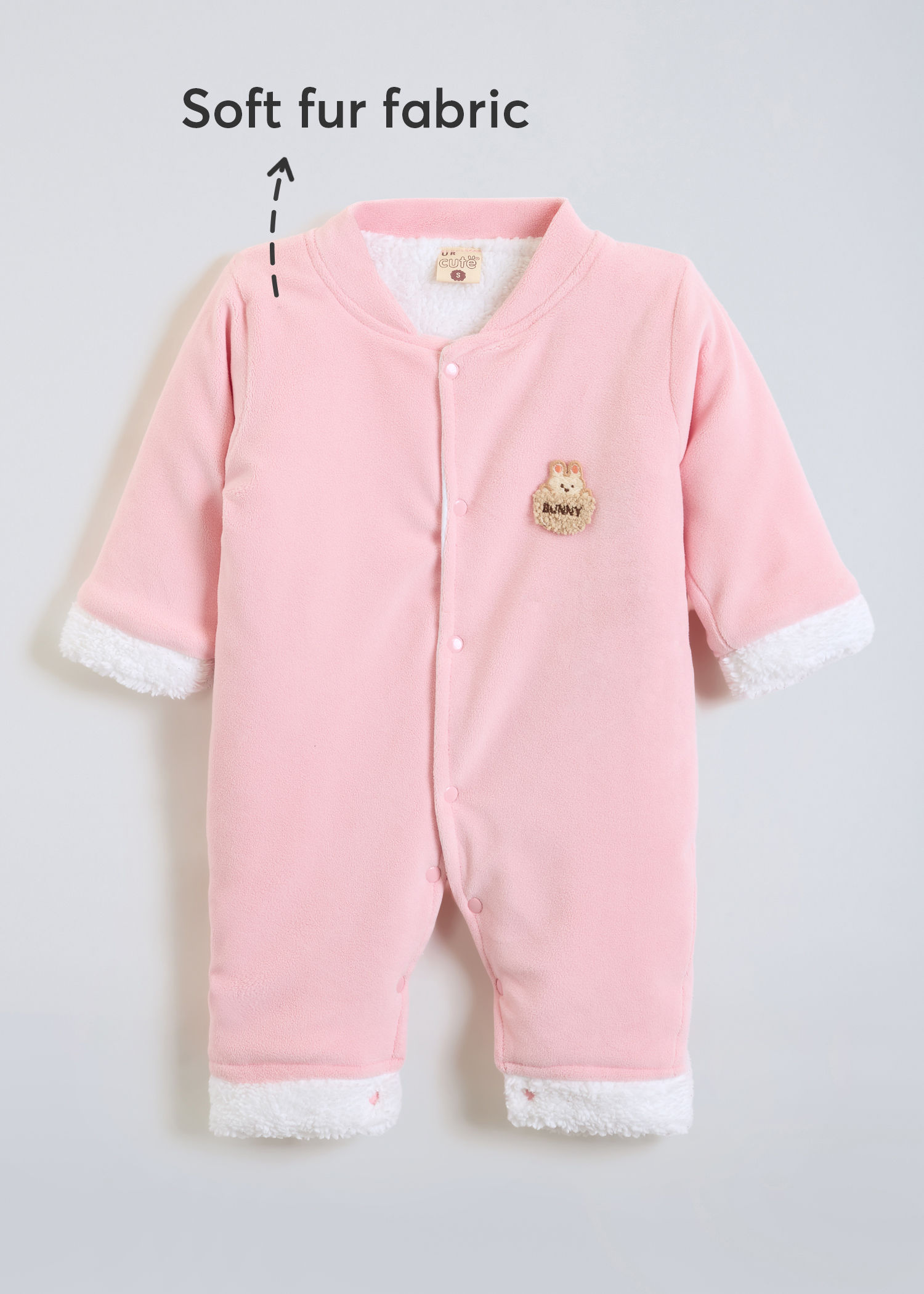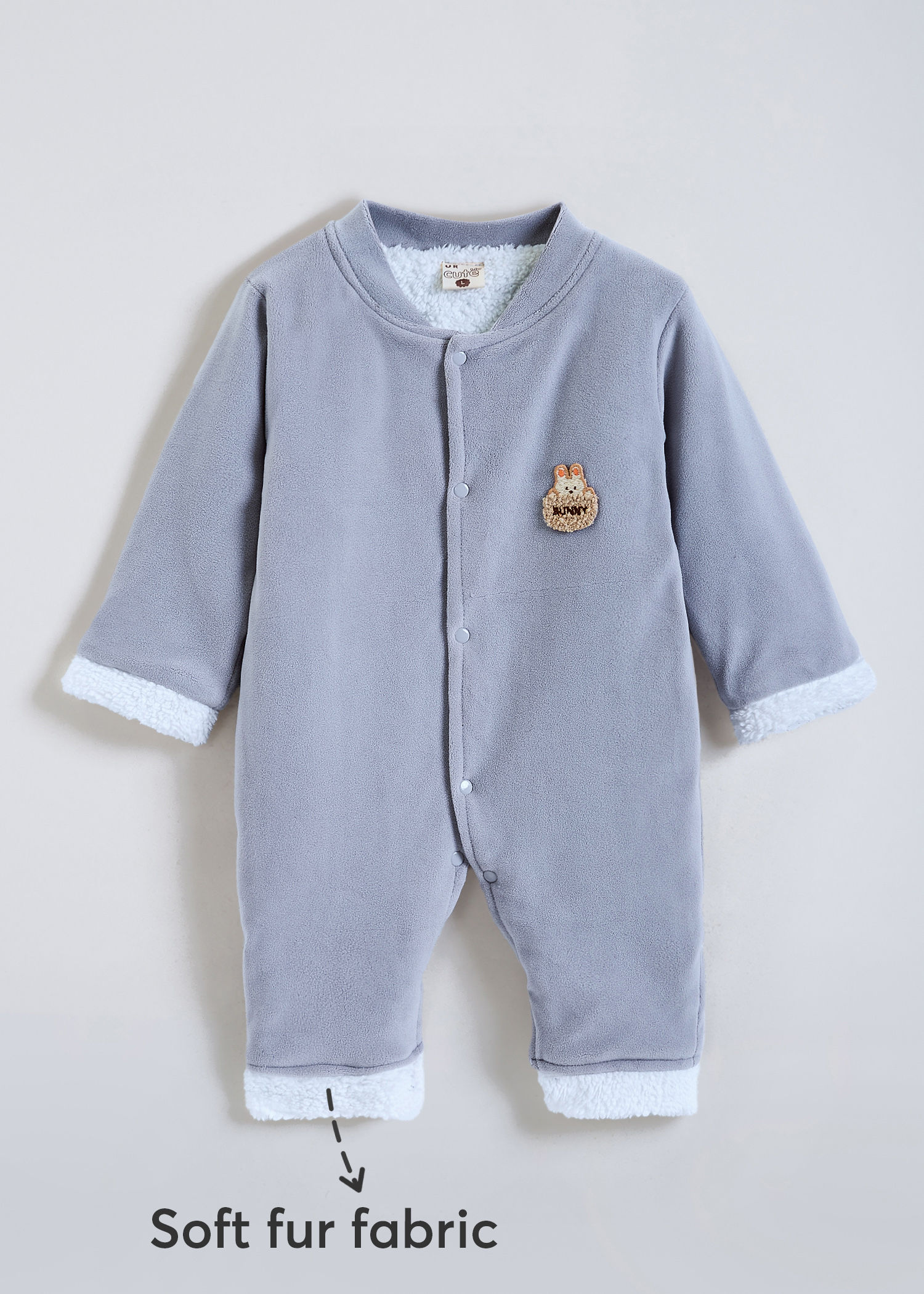 Front-button faux fur romper with easy snap closure at the bottom and applique chest detail ensures all-day comfort and hassle-free dressing.
