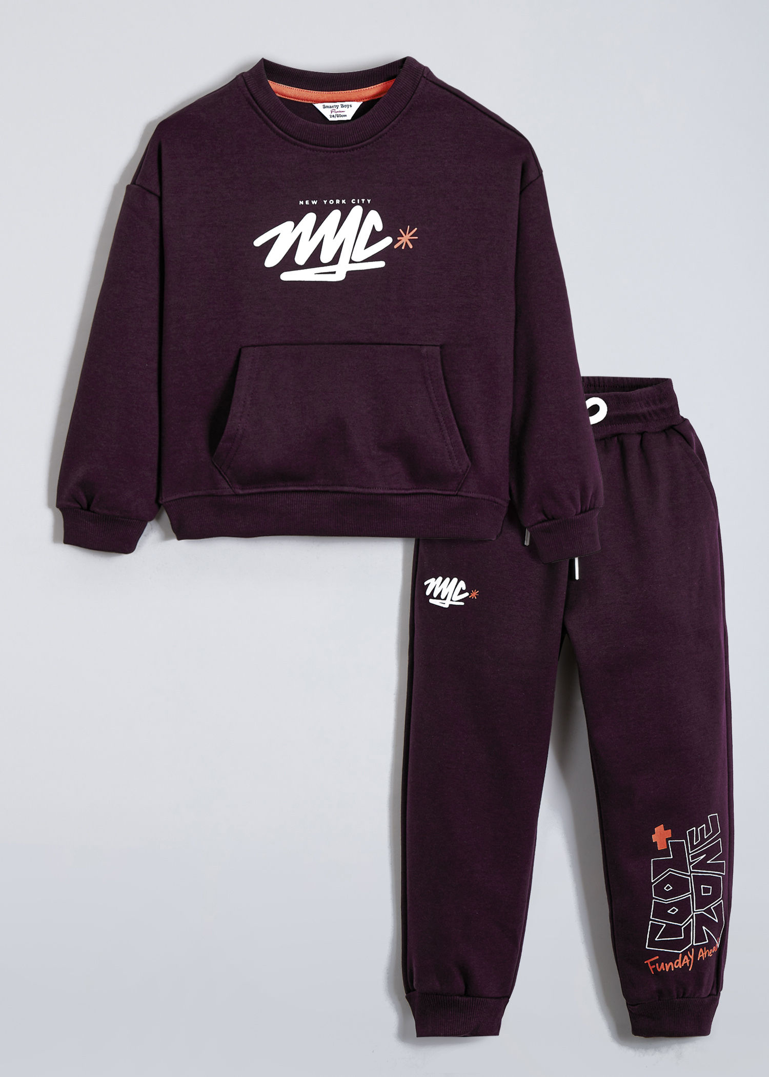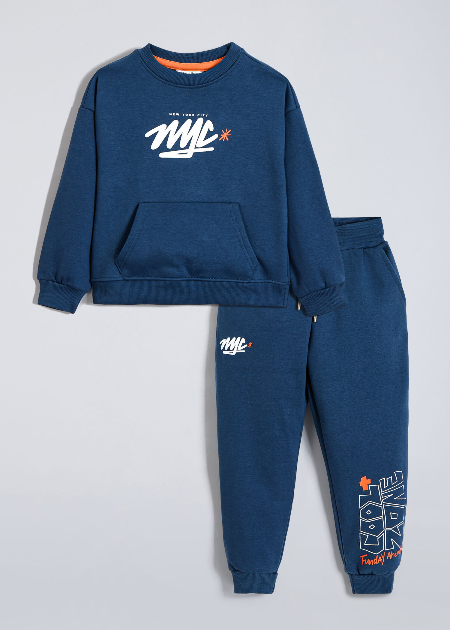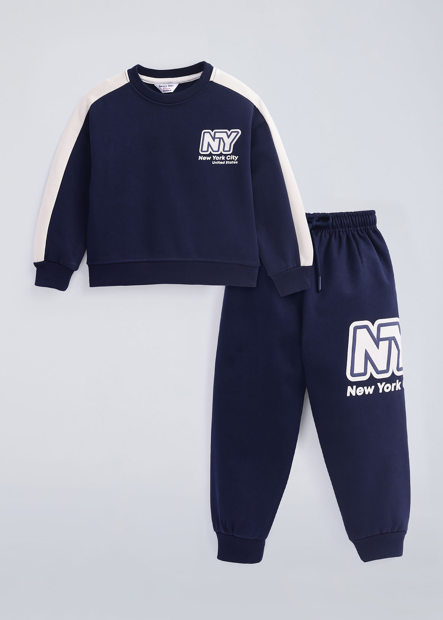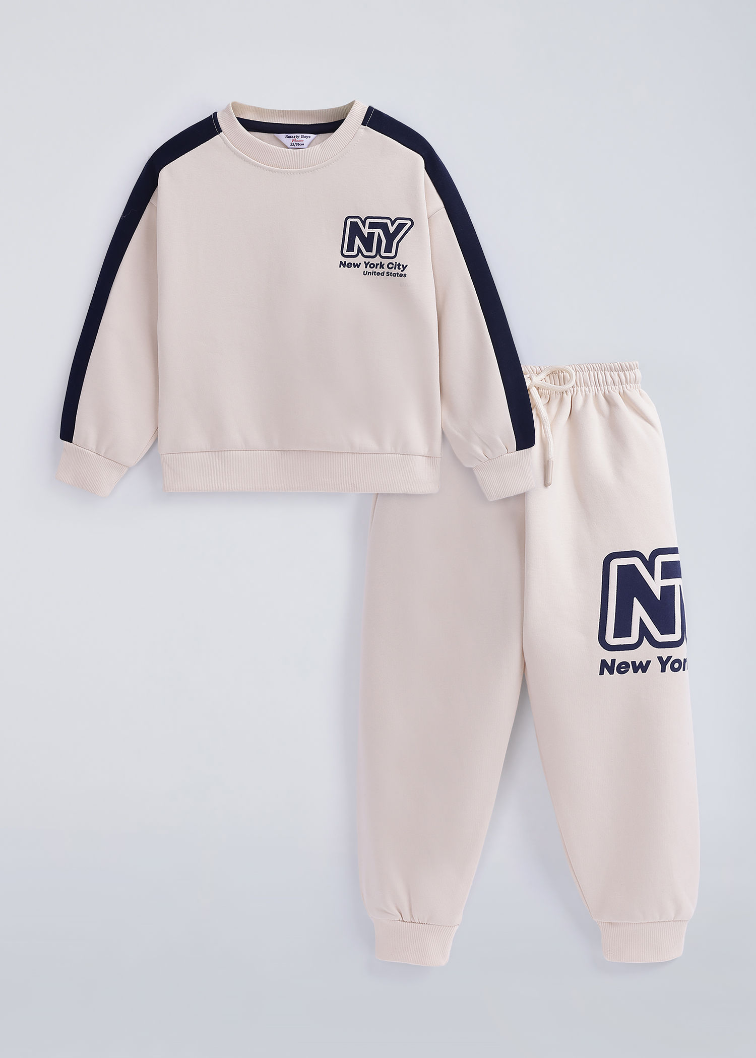 Athletic-inspired detailing meets neutral tones in a matching set with contrasting shoulder panels and city branding. Soft fleece fabric with ribbed trims and drawstring joggers creates a look that's equal parts sporty and cozy.