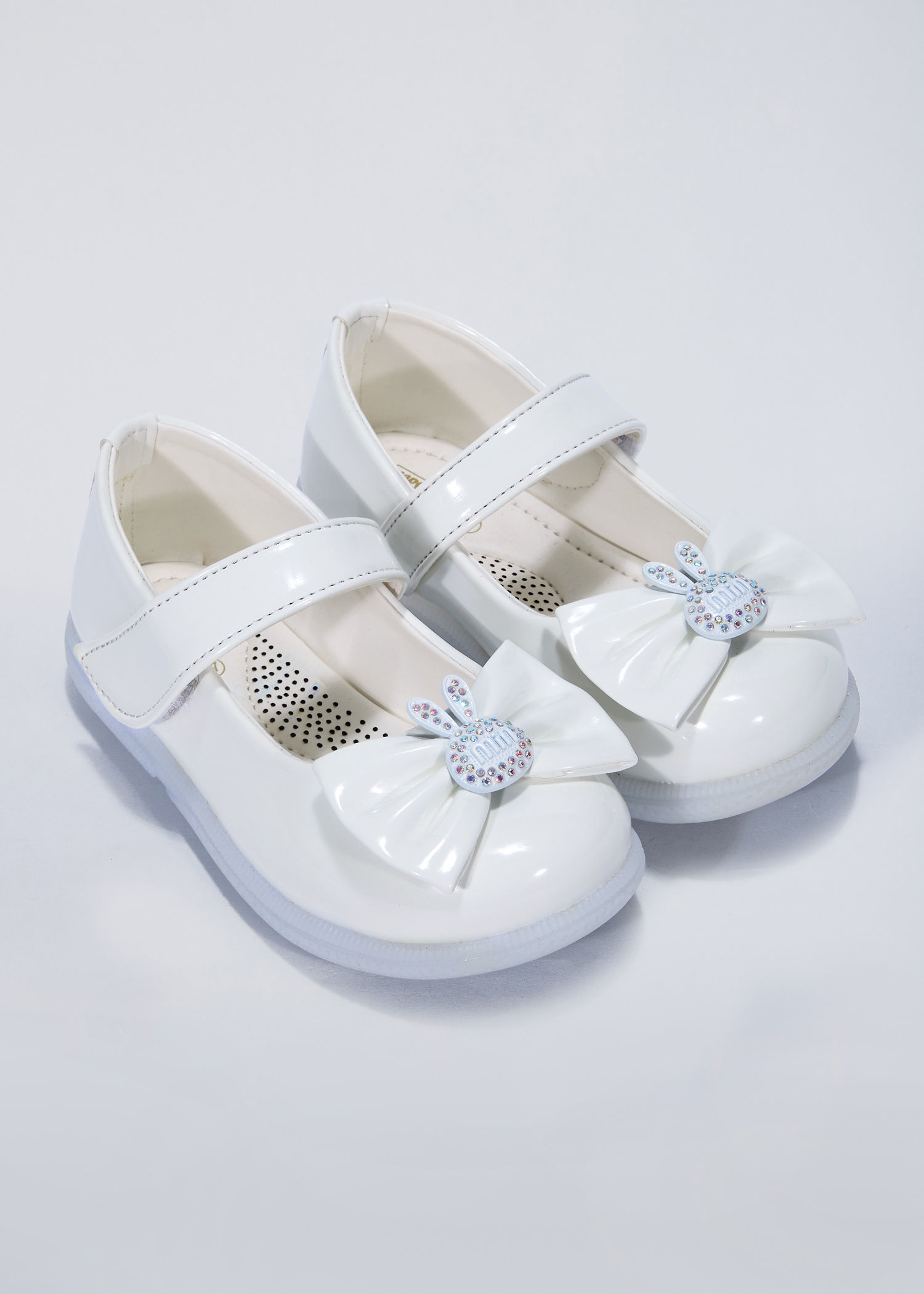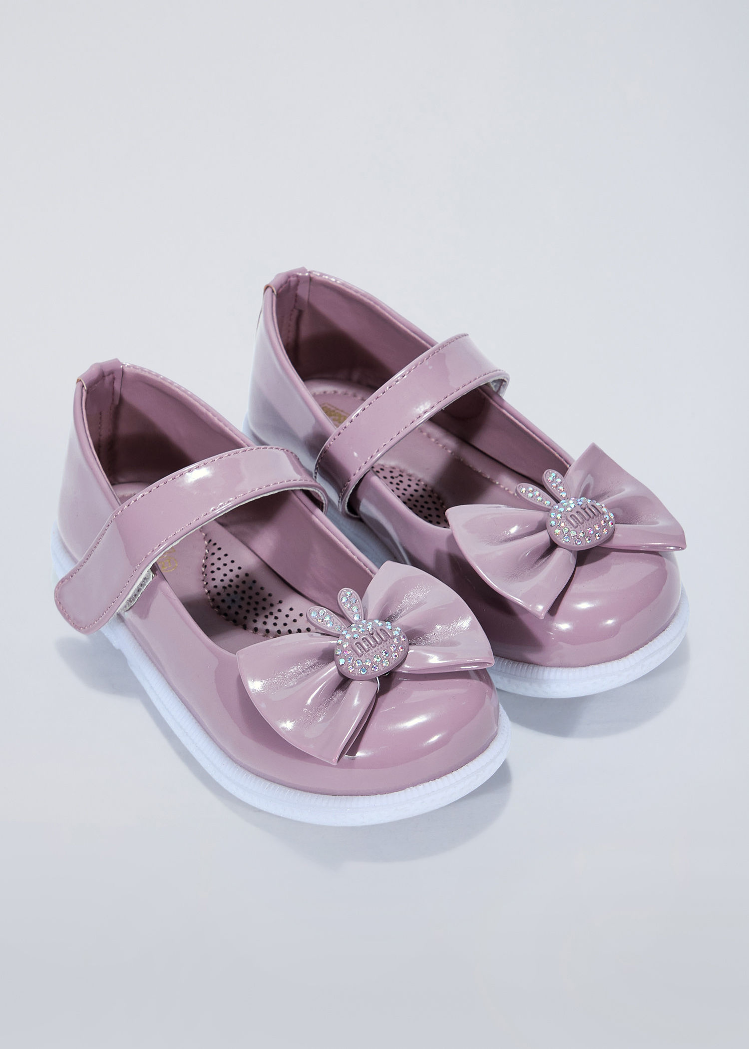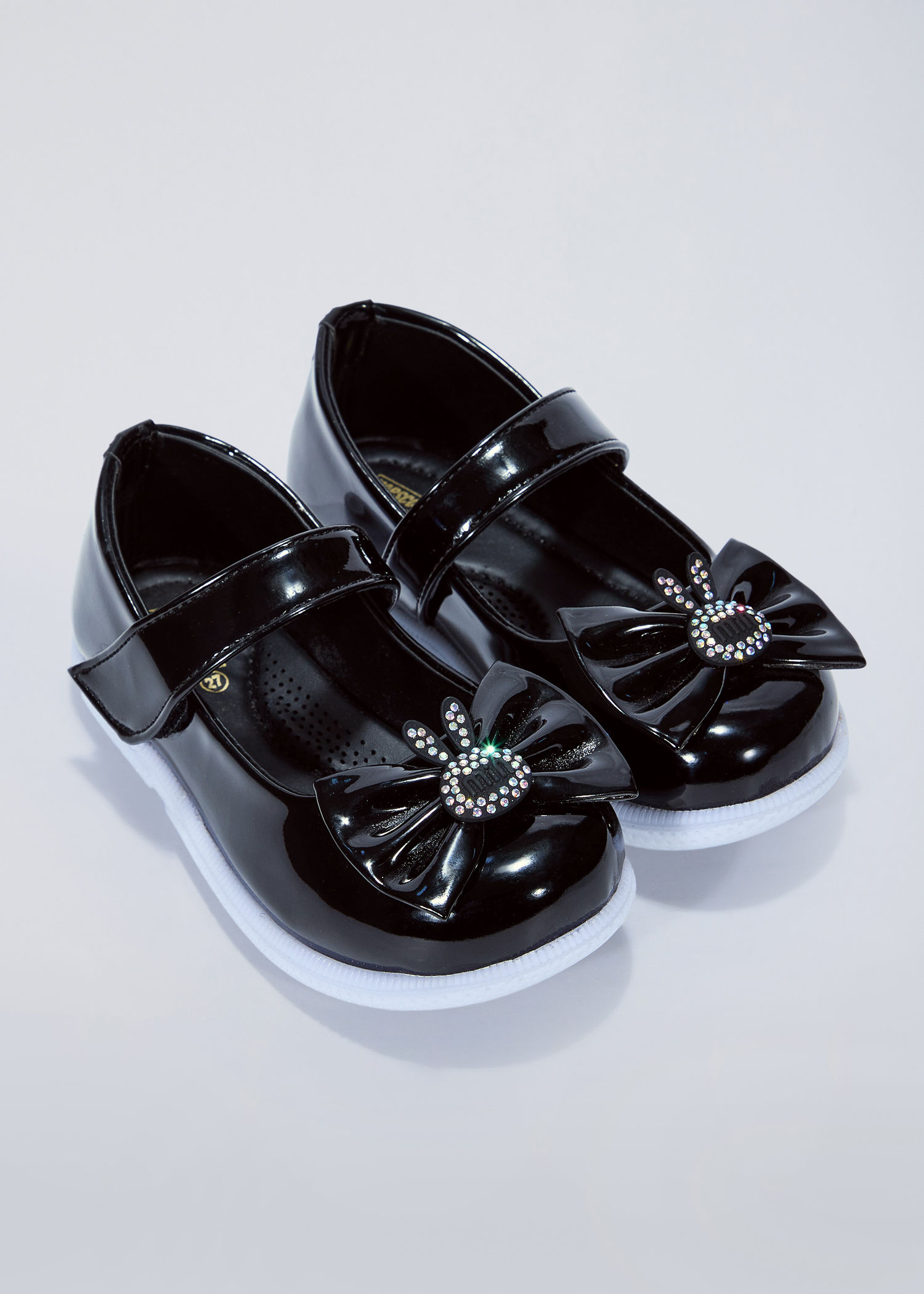 Glossy Mary Janes with a cushioned insole and lightweight flexible sole for easy movement. The secure strap offers a snug fit, while the bow detail adds a stylish touch perfect for parties, school wear, and all-day comfort.