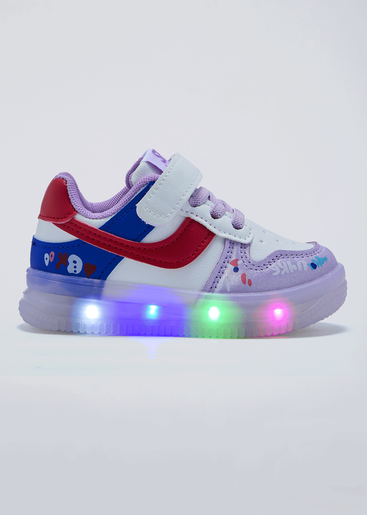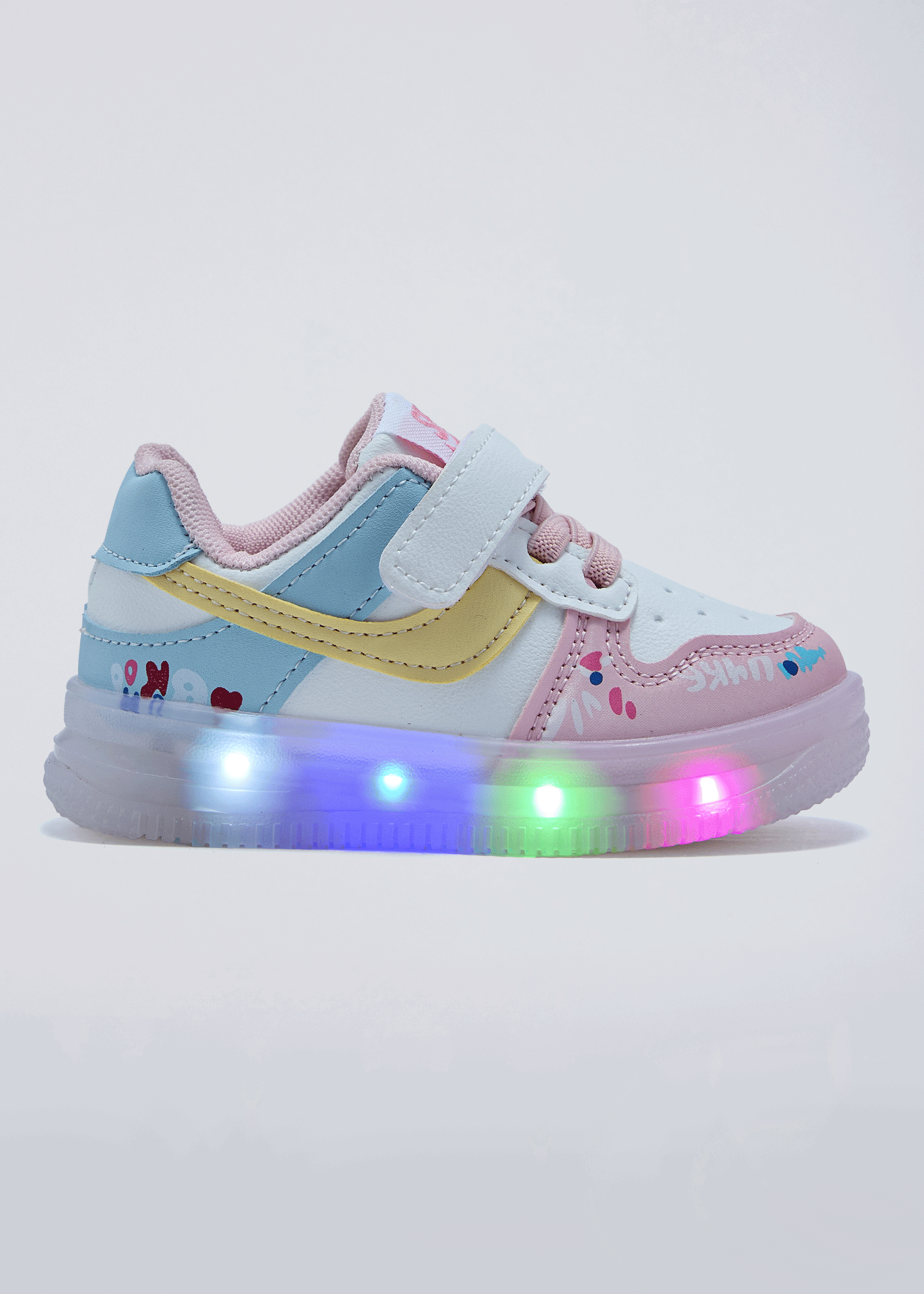 Pastel paneling meets rainbow LED lights in these playful sneakers that literally brighten up any outfit. The velcro closure and character graphics combine convenience with kid-approved style that shines.