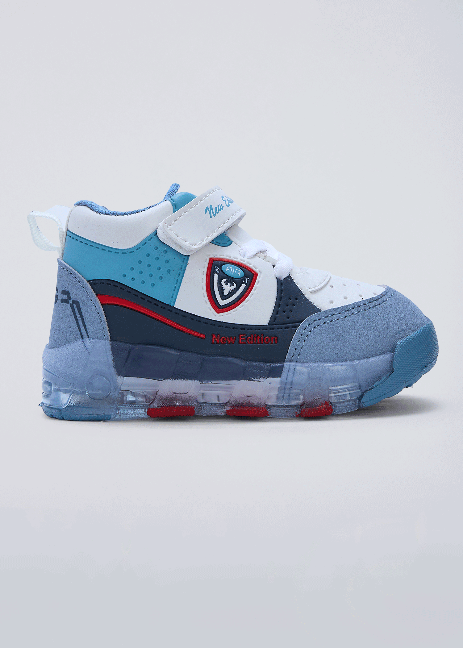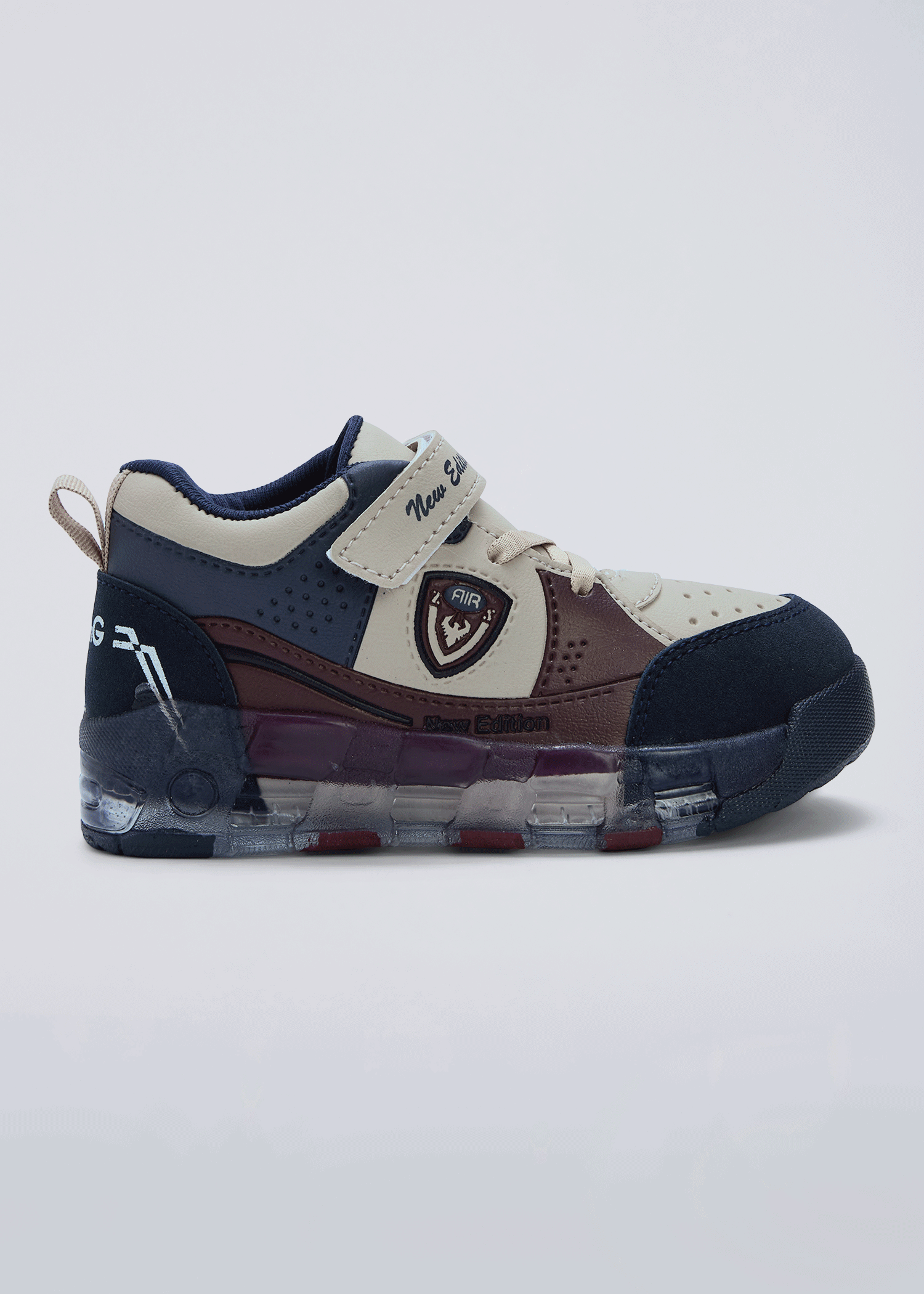 Same shield badge hi-top silhouette in deeper, earthier tones with a light-up sole delivers a rugged, adventure-ready look with serious street-sport attitude.